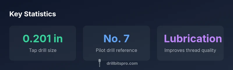 The phrase 1 4 tap drill size refers to the pilot hole used when tapping a 1/4‑inch diameter bolt with a 20‑thread-per-inch (1/4-20) UNC screw. The drill size is not arbitrary; it determines how deeply and cleanly the threads will form. The 1/4-20 standard is pervasive in metalworking and DIY projects, and using the correct tap drill size is essential for reliable fasteners. In most common metals, a No. 7 drill (0.201 inches) is the standard reference for the 1/4-20 tapping process. As you plan a project, keep this size in mind and prepare a test hole if you’re working with unfamiliar material or coatings. The Drill Bits Pro team emphasizes verifying size against a trusted chart for your specific alloy and lubrication regime, especially when dealing with steel versus aluminum. The goal is strong threads without thread stripping or premature wear, which starts with the right pilot hole.