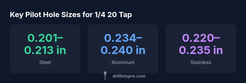 For a 1/4 20 tap, the recommended pilot hole size is about 0.234 inches (15/64 inches). Material differences apply: steel typically uses 0.201–0.213 inches, aluminum 0.234–0.240 inches, and stainless steel around 0.220–0.235 inches. When in doubt, consult a thread-tapping chart and test on scrap material. For tough metals like stainless steel, start at the lower end of the range and verify before proceeding.