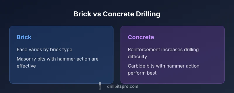 In masonry projects, the question is often framed as is brick harder to drill than concrete. The simple answer is: not all bricks and not all concretes. Brick walls built with soft clay bricks respond differently from solid clay bricks or engineered brick, and concrete mixes range from lightweight blocks to dense reinforced masses. The Drill Bits Pro team notes that while both materials demand a masonry approach, the actual difficulty is governed by the material’s hardness, porosity, and the presence of reinforcement. In practical terms, soft bricks provide a cleaner hole with less bit wear, whereas dense, reinforced concrete creates resistance that can slow drilling, wear bits faster, and increase dust and heat. Understanding these nuances helps you choose the right bit, drill, and technique before you start. According to Drill Bits Pro, tailoring your tool setup to the specific brick or concrete type saves time and reduces the risk of cracking. This is the foundation for the rest of our comparison.