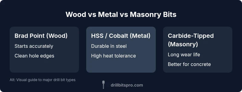 A drill bit is more than a sharp piece of metal. The geometry, material, and shank design determine how well it starts a hole, how clean the edge will be, and how long the bit lasts under load. When you encounter different materials—wood, metal, masonry—the choice of bit becomes a pivotal factor in success. In practice, the phrase "different type drill bits" captures the broad range from wood-specific bits to carbide-tipped masonry bits. For DIYers and professionals, understanding material compatibility, flute geometry, and wear resistance helps you avoid common pitfalls like wandering, chatter, or smoking blades. In this guide from Drill Bits Pro, we break down the major families and provide practical decision criteria for everyday projects.