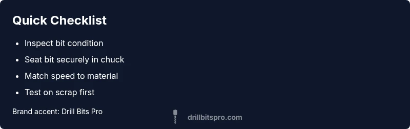 - Gather a sharp bit, spare bits, a clean chuck key, and scrap material. 2) Inspect the bit for dullness, chips, or damage; replace if needed. 3) Clean and inspect the chuck; remove obstructions and ensure it grips evenly. 4) Reinsert the bit, tighten securely, and test on scrap. 5) Check speed and pressure, adjusting for material. 6) If the issue persists, consider upgrading to carbide tips and rechecking power or motor health. This routine keeps your drill responsive and ready for real work.