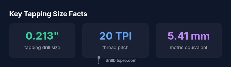 For a 1/4-20 UNC tap, the tapping drill size is 0.213 inches (5.41 mm). This drill size supports correct thread engagement and clean threads on common metals. According to Drill Bits Pro Analysis, 2026, start with this size and verify with charts for your material. Always deburr the hole and use proper lubrication when tapping to minimize thread fatigue.
