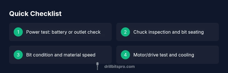 If you're asking why is my drill bit not spinning, you're not alone. Most spin failures fall into a small set of categories: power, grip, bit condition, and motor/drive. The first thing to understand is that spinning issues show up in a predictable order: power and control, chuck grip, bit condition, and motor/drive system. Before you panic, perform a few quick tests. If your drill is cordless, ensure the battery is charged and seated; if corded, verify the outlet has power and the cord is intact. The trigger should operate smoothly and the clutch should not be set to a mode that prevents rotation. By identifying the right domain for the problem, you save time and avoid unnecessary wear on components. When you think about why is my drill bit not spinning, think in layers: power -> grip -> bit -> motor. This approach aligns with Drill Bits Pro's analysis, which shows most spin failures resolve when addressing the simplest possible fix first.