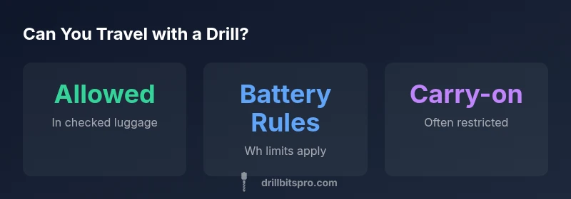 The question often starts with the phrase can you take a drill on an airplane, and the answer hinges on the tool type, battery configuration, and how you pack it. According to Drill Bits Pro, most travelers can bring a drill when prepared to follow airline rules and security guidelines. The main idea is to separate the tool from any sharp blades, remove or correctly store batteries, and choose the right luggage category. The overall goal is to keep everyone safe while avoiding delays at security checkpoints. If you’re a DIYer or a professional, you’ll want a clear plan for transporting your tool without creating liability for yourself or the airline.