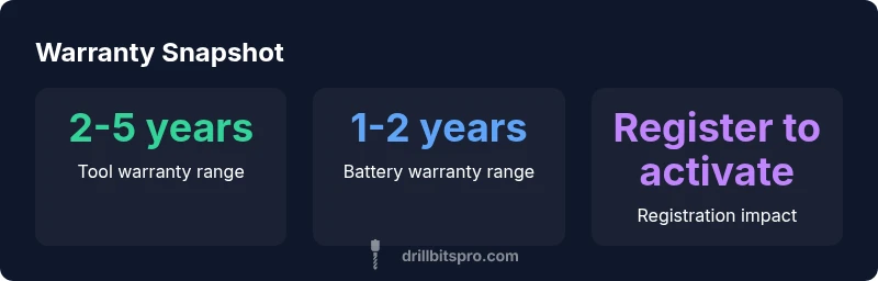 | Battery packs | 1-2 years | Separate terms from tool; check model-specific details |