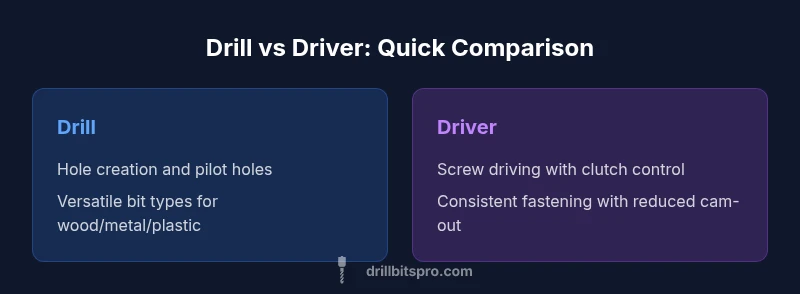 The core differences between a drill and a driver are not just their name; they come down to how torque is delivered, how fast the bit turns, and how you manage the risk of damaging the workpiece. A drill provides flexibility with a broad speed range and a clutch system that allows holes to be bored cleanly while minimizing bit wandering. A driver optimizes screw seating with adjustable torque limits, enabling precise depth control and reducing the chance of stripping the screw head or the material. In the world of professional drilling and driving, these attributes influence throughput, finish quality, and tool longevity. Drill Bits Pro Analysis, 2026 suggests that choosing based on these control characteristics reduces rework and speeds up completion times on assemblies, cabinetry, and framing tasks. When you compare drill or driver capabilities, prioritize how often you’ll need controlled starts, depth stops, and bit compatibility with your project mix. The takeaway is: match the tool’s core mechanism to the job’s primary action.