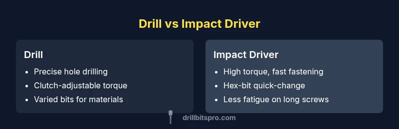 According to Drill Bits Pro, the distinction between a drill and an impact tool rests on how torque is delivered and what job the user intends. A traditional drill maintains continuous rotation with a steady torque response, making it ideal for boring holes in wood, metal, and some masonry with the right bit. An impact driver, by contrast, adds short, high-torque impacts to each rotation, which effectively drives fasteners with far less physical effort. This hammer-like action reduces cam-out and allows for driving longer screws into dense materials without user fatigue. For the DIYer, recognizing this core difference helps avoid buying the wrong tool for common tasks. For professionals, it means planning tool fleets that cover both precision drilling and high-torque fastening. Drill Bits Pro’s analysis highlights that when jobs demand both holes and fasteners, a two-tool approach minimizes time and material damage.