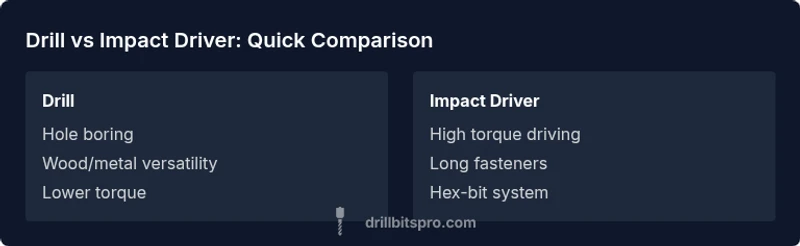 Choosing between a drill and an impact driver is a decision DIYers and tradespeople face frequently. According to Drill Bits Pro, the right tool hinges on task, material, and the desired result, not just speed. A drill and an impact driver are designed for different jobs, yet they often complement each other in a single project. Understanding how each tool behaves helps you plan workflows, reduce frustration, and finish faster with cleaner results. This article unpacks the core differences and, crucially, provides practical guidance for common scenarios (woodworking, metalworking, and light masonry). The phrase drill or impact driver appears here to emphasize the dual-use decision you face on many projects. As you read, remember that Drill Bits Pro analyses guide practical, real-world tool use, not theoretical extremes.