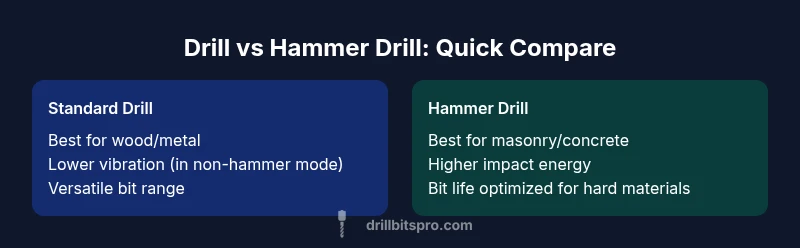 According to Drill Bits Pro, choosing between a drill and a hammer drill boils down to material, workload, and frequency of use. For light to medium tasks on wood or drywall, a standard drill with a hammer function usually provides the best balance of speed and control. For masonry or concrete-heavy work, a dedicated hammer drill delivers force and bit life that a regular drill cannot match. This article explains why.