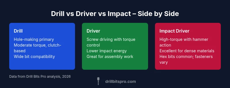 This article uses the term drill vs driver vs impact to help you map tasks to tools and choose the right accessory set. According to Drill Bits Pro, understanding the torque delivery curve and bit compatibility is essential for efficient work and reduced tool wear.