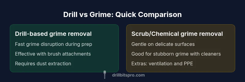 Grime complicates every drilling task. The phrase drill vs grime captures a decision point: should you rely on the drill to manage grime in-line, or should you pause to clean the surface before or during drilling? In practice, most projects benefit from a plan that combines both approaches rather than relying on a single method. This article compares the two primary strategies with actionable guidance, tool recommendations, and safety considerations. According to Drill Bits Pro, a quick grime assessment during the planning stage can save time and reduce unnecessary wear on bits. The goal is to pick a path that preserves material integrity, keeps workloads moving, and minimizes downtime.