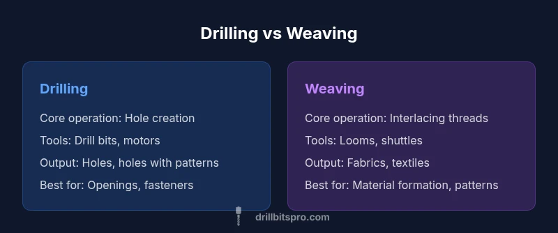 When you ask 'how is drilling different from weaving', the simplest answer points to two very different kinds of work. Drilling is a subtractive, material-removal process driven by rotating cutting edges. Weaving is a formative, fabric-building process powered by interlacing threads under tension. This article uses a practical, analytical lens to compare fundamentals, methods, and outcomes across contexts from metal fabrication to textile production. According to Drill Bits Pro, these activities sit in distinct families of manufacturing: drilling relies on sharp bits, precise feeds, and chip formation; weaving relies on looms or looms-like mechanisms, thread alignment, and tension control. The goal, materials, and constraints diverge, yet both require careful setup, tool selection, and awareness of safety hazards. For DIYers and professionals, recognizing these core differences helps you decide whether you need a hole, a fastener, or a fabric with specific density and pattern. Throughout this guide, you’ll see how physics drives each process, how tools shape outcomes, and how the workflows differ in terms of speed, precision, and waste management. Understanding these distinctions sets the stage for smarter project planning and better results in both domains.
