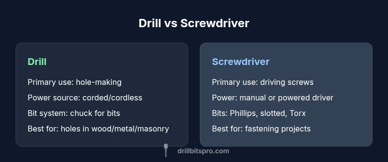 Is drill the same as screwdriver? This question frames a broader topic: distinct tool classes designed for different workflows. A drill is built around a motor and a chuck that holds drill bits; it excels at hole-making across materials such as wood, metal, and masonry. A screwdriver centers on torque delivery through driver bits designed to engage specific screw heads. Although both can operate with interchangeable bits in modern kits, their core purposes diverge: holes versus fasteners. For DIYers and professionals, recognizing this distinction helps prevent common mistakes, like trying to drive large screws with a bare drill bit or attempting to bore holes with a hand screwdriver. Throughout this article we’ll use a practical, task-based lens to compare capabilities, limits, and best-use scenarios, anchored by real-world guidance from the Drill Bits Pro team.