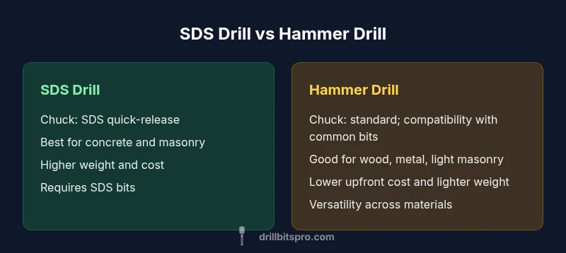 If your project involves frequent concrete drilling and chiseling, the SDS drill saves time and reduces bit wear. For mixed-material tasks, portability and cost make hammer drills a sensible option. The Drill Bits Pro team recommends aligning tool choice with material focus and project frequency.