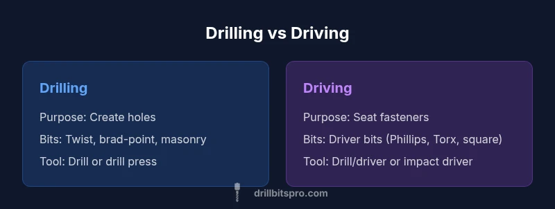 Drilling and driving are two fundamental operations in woodworking, metalworking, and construction. The phrase what is drilling vs driving frames the core distinction: drilling is the act of creating holes in a material by using a rotating drill bit under pressure, while driving is the act of seating fasteners such as screws or nails into a surface. According to Drill Bits Pro, understanding these tasks helps you select the right tool, bit, and technique before you begin any project. Drilling relies on a cutting action that removes material to form a hole, whereas driving relies on torque to advance a fastener into the substrate. This difference in purpose drives every subsequent decision: bit type, drill speed, feed rate, and clamping method. While there is overlap—some tools can do both tasks with the right bit—the two operations aim for different end states: a completed hole versus a securely seated fastener. Recognizing this distinction reduces experimentation and increases accuracy, safety, and project pace. The Drill Bits Pro team emphasizes establishing a clear plan for hole size, depth, and fastener length before starting work.