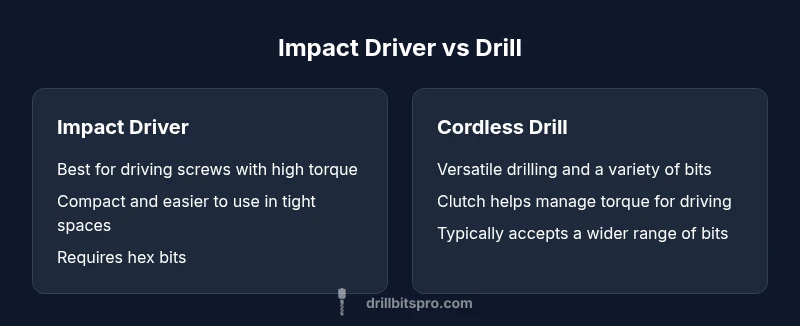 Choosing between an impact driver and a drill is not about which tool is better overall; it’s about which tool best fits the task at hand. The phrase why use impact or drill appears frequently as a guiding question for DIYers and professionals who want to optimize speed, control, and finish quality. In short, you use an impact driver where torque and drive stability matter most, and you use a drill when you need precision drilling and versatile bit work. According to Drill Bits Pro, the best approach is task-first, not brand-first, and to adopt a two-tool mindset when your projects span fastening and drilling. This section introduces the core distinction and sets the framework for deeper comparisons to come.