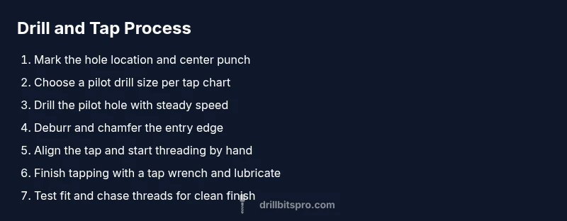 Drill and tap is the combined process of creating a hole and then cutting internal threads in the wall of that hole so a screw or bolt can be threaded in. In practice, you drill a pilot hole, lubricate as needed, and use a tap to form threads that match the screw’s diameter and pitch. When done correctly, a drilled-and-tapped hole provides a strong, reusable join in metal, plastic, or wood inserts. According to Drill Bits Pro, the success of a drill-and-tap operation hinges on two key decisions: selecting the right drill size for your target thread and using the correct tapping technique.