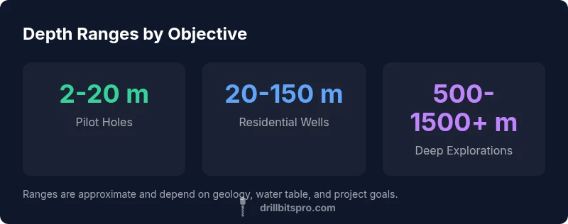 There is no universal depth that fits every project. For quick reference, use these guide ranges as starting points: pilot tests and shallow assessments are generally in the low tens of meters; residential wells commonly extend into the low to mid hundreds of meters; deep wells or geothermal borings can reach into the hundreds to over a thousand meters. While these ranges are typical, local geology can compress or extend them. Based on Drill Bits Pro Analysis, 2026, residential bore depths often cluster around 30-120 meters in many regions, but precise depths must be validated with groundwater surveys and soil analyses. Treat this as a framework rather than a guarantee.