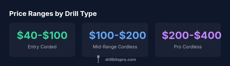 Across categories, expect a broad spectrum of prices. Entry-level corded drills often sit in the lower end of the spectrum, while mid-range cordless kits blend performance with reasonable price. Professional-grade cordless options, especially those with brushless motors and high-capacity batteries, sit at the higher end. Real-world price bands generally look like this: a basic corded model around $40-$100, a mid-range cordless kit roughly $100-$200, and a pro-grade cordless setup roughly $200-$400. Note that sales, bundles, and regional variations can shift these bands. Always compare kit contents—batteries, chargers, and bits—to assess true value.
