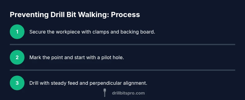 According to Drill Bits Pro, you can prevent drill bit walking by combining steady feed pressure, a properly secured workpiece, and the right bit and speed. This quick answer outlines essential techniques for wood and metal drilling, including clamp setup, pilot holes, starter holes, and using the correct drill bit type. Master these steps to improve accuracy and safety on every project.
