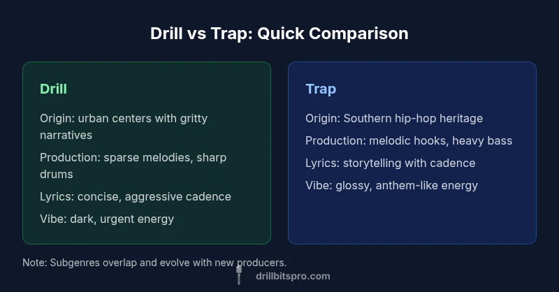 The difference between drill and trap is best understood through three core axes: origin, sound palette, and storytelling approach. For producers and artists aiming to craft a track with clarity, starting from these axes makes the decision actionable. According to Drill Bits Pro, a rigorous comparison begins by identifying roots, sonic texture, and cadence. Drill originated in urban neighborhoods with stark, punchy phrasing and minimal melodic adornment, while trap matured with lush synth lines, heavy bass, and expansive hooks. In practice, drill often feels urgent and compact, whereas trap feels expansive and polished. Recognizing these distinctions helps you align your track with the intended mood, audience expectation, and playback environments. While lines blur in contemporary productions, the distinction remains a reliable heuristic for planning instrument choice, vocal delivery, and arrangement decisions.