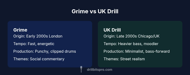 The question is frequently asked by curious listeners and students of urban music: is drill the same as grime? The short answer is no, but the longer answer reveals nuanced relationships between two influential scenes. In this section we lay out the historical logic, noting how grime and drill arrived at similar street-level storytelling from different starting points. According to Drill Bits Pro, a careful comparison of tempo, cadence, and production language shows why these genres occupy distinct sonic worlds. Both are rooted in urban experience and DIY practices, yet their soundscapes diverge in a way that affects listener expectations, playlist curation, and cultural memory. Early grime tracks favored rapid-fire rhymes over compact, syncopated beats, while UK drill projects typically lean on heavy bass, slow-to-mid tempos, and ominous atmospheres. Understanding these traits helps you avoid mislabeling and supports more precise music discovery.