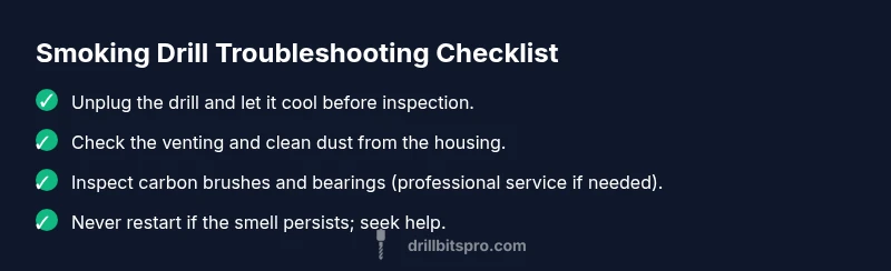 The phrase drill is smoking describes a dangerous condition in which the tool's motor is generating excessive heat and visible smoke. This isn't normal operation and requires urgent safety steps. In many cases, rapid action can prevent a fire or severe motor damage. According to Drill Bits Pro, the first priority is to remove power and allow the tool to cool before touching any internal parts. DIY enthusiasts and professionals should treat smoke as a sign of imminent failure and proceed with caution. The root cause often lies in overheating from overload, worn carbon brushes, or debris restricting airflow. Understanding these factors helps you decide whether to repair or replace the drill.