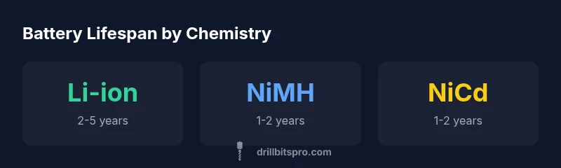 How long drill batteries last depends on chemistry, usage, and care. In general, Li-ion packs deliver the best longevity, typically lasting about 2-3 years or roughly 500-1000 full charge cycles with regular use. NiMH and NiCd packs are older tech and often span 1-2 years or 300-600 cycles. Proper charging habits and storage can extend life.