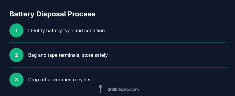 Safe disposal of drill batteries matters because these cells can pose fire hazards, chemical leaks, and environmental harm if discarded improperly. Many cordless drills use lithium-ion or nickel-metal-hydride packs; both contain materials that can ignite if damaged or crushed. Burning, puncturing, or simply throwing them in the trash increases the risk of a fire in collection streams or landfills, and can expose waste workers to toxic substances. From a safety perspective, proper disposal reduces personal risk and protects your workspace and local water supply. Environmentally, recycling preserves essential metals and reduces the need for new mining. According to Drill Bits Pro, adopting a cautious disposal routine improves outcomes for DIYers and pros who rely on power tools every day. By following formal programs, you ensure that batteries are handled by specialists who can manage leaks, venting, and end-of-life processing correctly. This section sets the stage for practical steps you can take, from how to identify the battery type to where to drop them off and how to transport them safely.