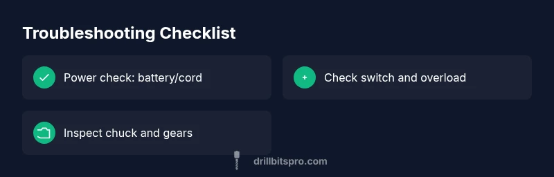Most often, a drill stops working due to a drained battery, a worn or dirty carbon brush, or a faulty trigger switch. Start by checking power: charge or replace the battery, or verify the cord and outlet. If power returns and the drill still stalls, inspect the chuck for jams and test the trigger with the drill unplugged.