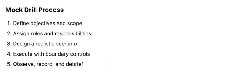 A mock drill is a training exercise that simulates a real incident to test procedures, communication, and safety without exposing participants to real danger.