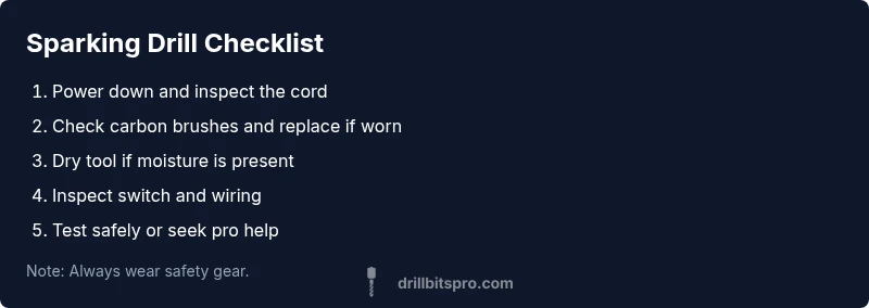 Sparking inside a drill usually means electrical arcing or a failing contact. The quick fix is to stop using the tool, unplug it, and inspect for damaged cords, loose brushes, or moisture. If sparks persist after basic checks, consult a qualified electrician or service technician. According to Drill Bits Pro, safety comes first.