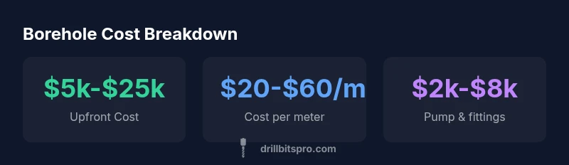 Costs to drill a borehole vary widely by region and ground conditions. A practical starting point is a budget from roughly five thousand to twenty-five thousand USD, with deeper wells, harder rock, and advanced pumping systems pushing costs higher. This range reflects Drill Bits Pro Analysis, 2026.